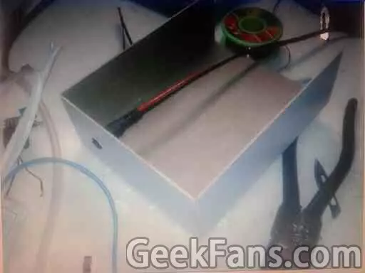 第一步:1.将密度板裁剪成合适大小。2.用热熔胶将密度板粘成盒子(盒子上面和右侧面不要安装)。3.在盒子左侧面开孔并用热熔胶将DC插座固定。